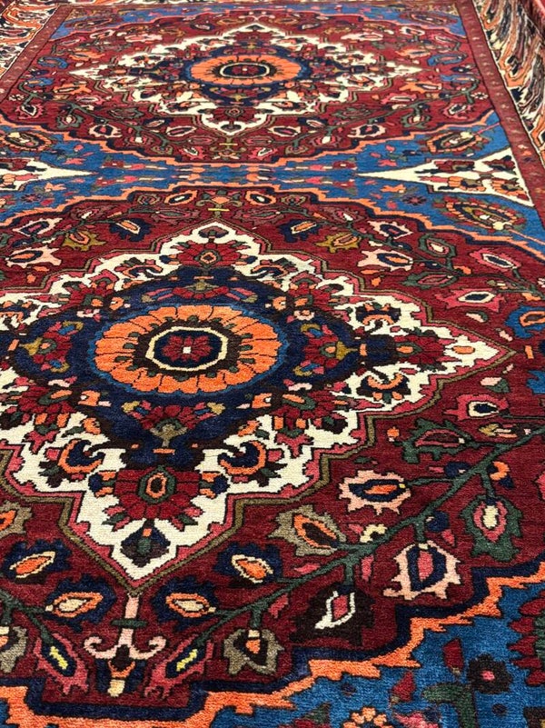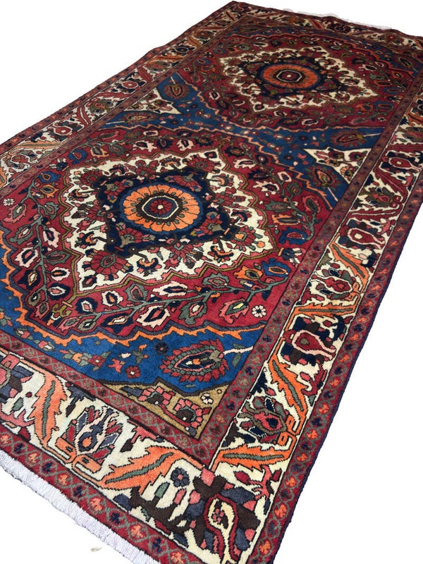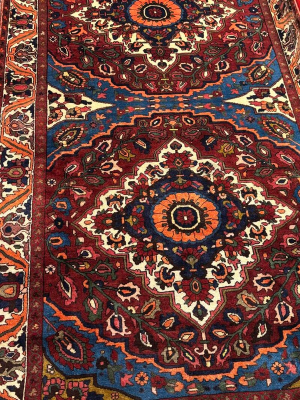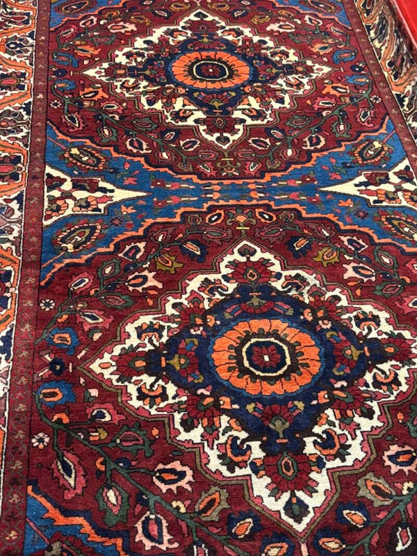The Bakhtiar Two Very Fine Rectangular Handwoven Persian Rugs - Twins (307 x 170 cm) and (340 x 167 cm) are a unique and elegant pair that add charm to any room. Handwoven from high-quality wool, these matching rugs feature intricate patterns and rich colours, offering a timeless design that enhances your home décor. Perfect for living rooms, hallways, or dining areas, their durable construction ensures long-lasting beauty and comfort underfoot. These twin Persian rugs bring harmony and style to your space, making them a perfect choice for those seeking a distinctive and coordinated look.